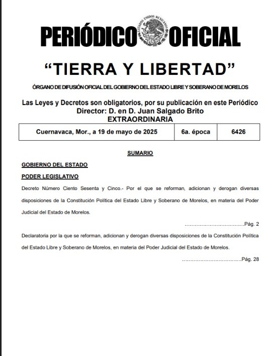 El Gobierno del Estado de Morelos publicó en el Periódico Oficial “Tierra y Libertad” la reforma judicial aprobada por el Congreso local, estableciendo que jueces y magistrados serán elegidos por voto ciudadano a partir de 2027.
