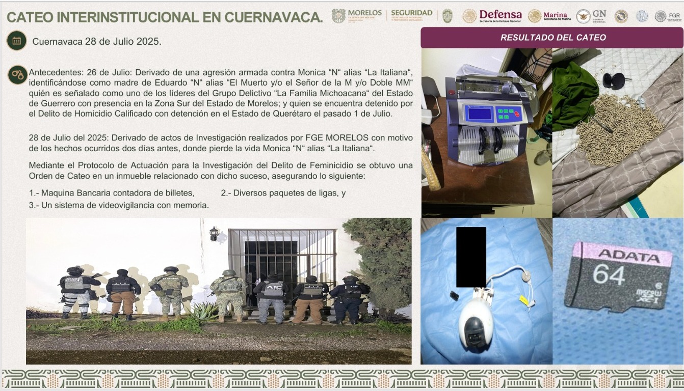 El 28 de julio de 2025, autoridades estatales y federales ejecutaron un cateo en un domicilio de Cuernavaca vinculado al asesinato de Mónica R. Su ejecución ocurrió dos días antes en un contexto que apunta a una posible represalia relacionada con estructuras del crimen organizado.