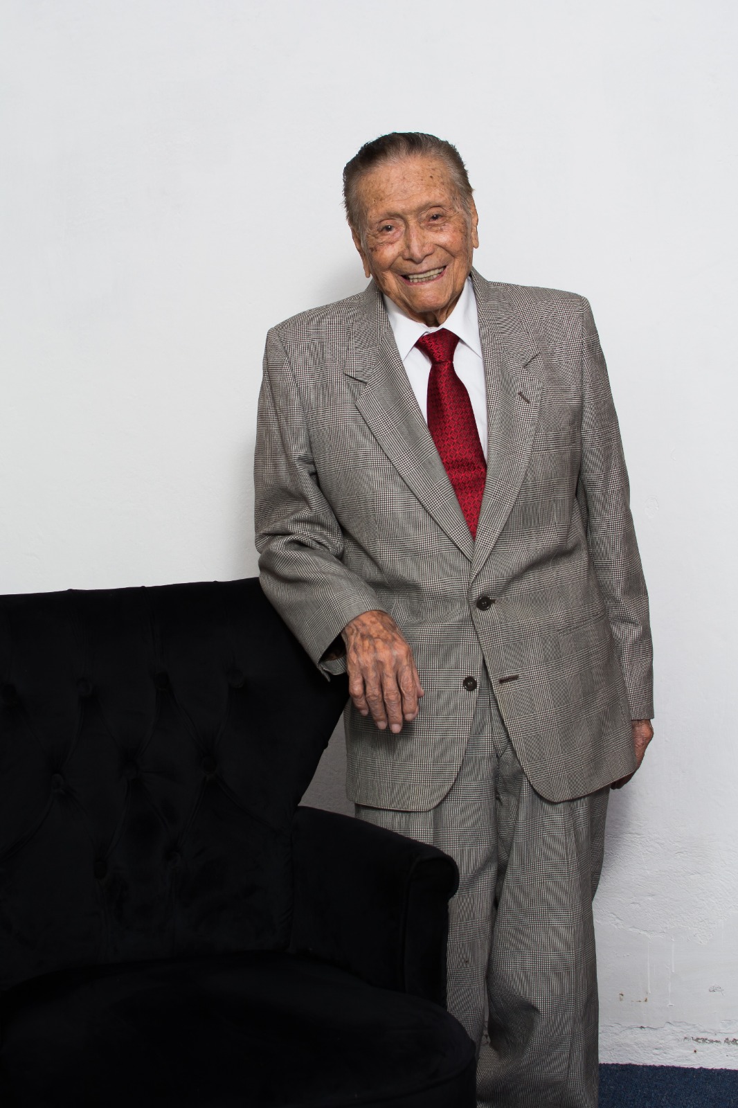La imagen lo captura de pie, traje gris de cuadros finos, corbata roja encendida, la mano apoyada en el respaldo de un sillón negro. El gesto no es de pose: es de bienvenida. La sonrisa abre un lugar para la memoria. Así entra en escena un médico que decidió tratar de “tú” a la vida… y, sin saberlo, también a la historia.