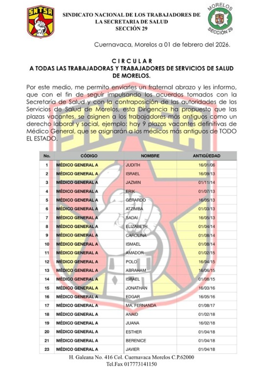 Circulares emitidas por la Sección 29 del Sindicato Nacional de los Trabajadores de la Secretaría de Salud (SNTSA) exhiben la existencia de plazas vacantes de médicos generales, médicos especialistas y personal de enfermería en Morelos que no han sido asignadas.